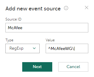 This event source sends logs through the SIEM software, so adding this event source by IP is not possible because all such event sources will have the IP address of the SIEM software. Instead, specify a regular expression that will identify this event source based on the data contained in the events. For example, the expression can match a device name or a device version that are contained in the events. Note that If your event source sends the events directly to Kaspersky CyberTrace, specify such source by its IP instead.