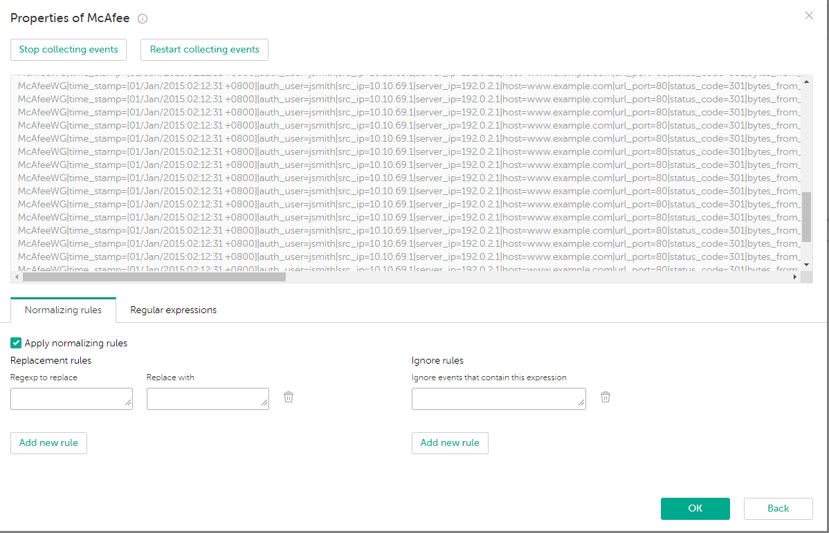 McAfeeWG|time_stamp=[01/Jan/2015:02:12:31 +0800]|auth_user=jsmith|src_ip=10.10.69.1|server_ip=192.0.2.1|host=www.example.com|url_port=80|status_code=301|bytes_from_client=279|bytes_to_client=1149|categories=Business, Software/Hardware|rep_level=Minimal Risk|method=GET|url=http://www.example.com/|media_type=text/html|application_name=|user_agent=Mozilla/5.0 (compatible; MSIE 10.0; Windows NT 6.2; WOW64; Trident/6.0)|block_res=0|block_reason=|virus_name=|hash=|filename=|filesize=753|
