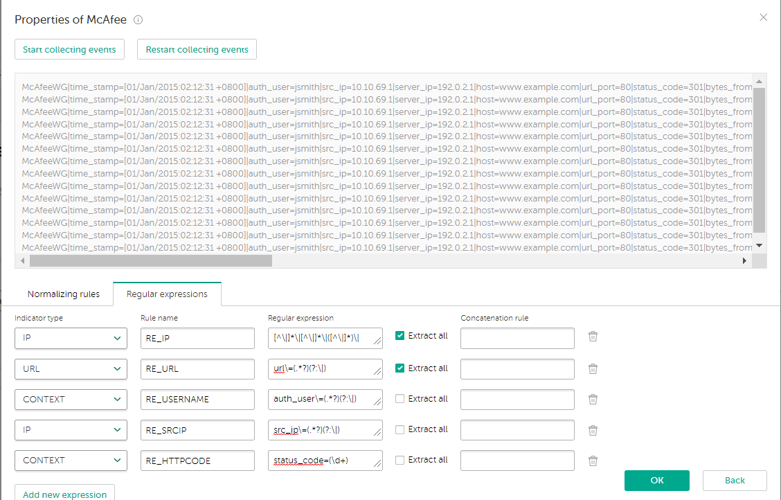 URL, IP, MD5 and other indicator types), add regular expressions of CONTEXT type. Regular expressions of CONTEXT type must match any information that will be relevant for the response, such as event identifiers, request identifiers, and time stamps. This context information will also help to search for raw events in the SIEM software, if required.CONTEXT regular expressions to the Detection events format field. To do so, specify the names of all regular expressions in the detection events format by using the %RegexpName% pattern.Example