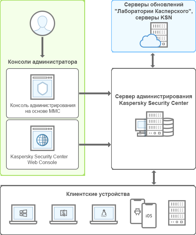 На рисунке ниже показана архитектура программы Kaspersky Endpoint Security для бизнеса, управляемой локально, и взаимодействие между компонентами Kaspersky Security Center, клиентскими устройствами и инфраструктурой "Лаборатории Касперского". Если ваша сеть содержит сотни или тысячи клиентских устройств, схема может включать дополнительные компоненты, такие как подчиненные Серверы администрирования или точки распространения.