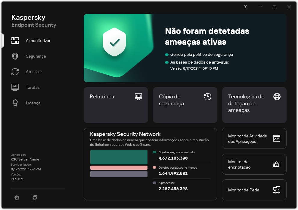 • Kaspersky Security Network. Estado da ligação entre o Kaspersky Endpoint Security e a Kaspersky Security Network, e estatísticas da KSN global. A Kaspersky Security Network (KSN) é uma infraestrutura de serviços na nuvem que fornece o acesso à Base de Conhecimento online da Kaspersky, que contém informações sobre a reputação de ficheiros, recursos da Internet e software. A utilização de dados da Kaspersky Security Network permite uma resposta mais rápida do Kaspersky Endpoint Security a novas ameaças, melhora o desempenho de alguns componentes de proteção e reduz a probabilidade de falsos diagnósticos positivos. Se participar na Kaspersky Security Network, os serviços da KSN irão fornecer ao Kaspersky Endpoint Security informações sobre a categoria e reputação dos ficheiros verificados bem como informações sobre a reputação dos endereços da Web verificados.