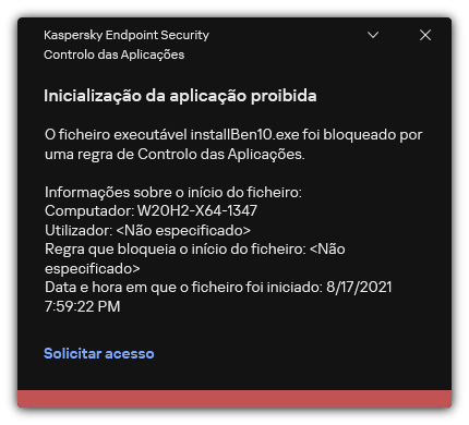 Quando um utilizador tenta iniciar uma aplicação bloqueada por uma Regra de Controlo das aplicações, o Kaspersky Endpoint Security apresenta uma mensagem a avisar que o arranque da aplicação está bloqueado. Se o utilizador considerar que o arranque de uma aplicação foi bloqueado incorretamente, o utilizador pode utilizar a ligação no texto da mensagem para enviar uma mensagem ao administrador local da rede da empresa.