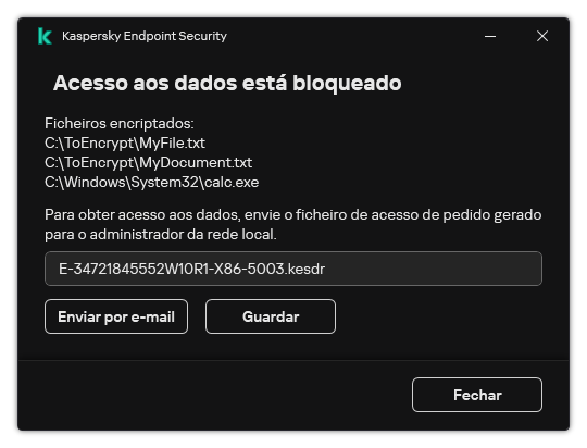 Para iniciar o procedimento de recuperação, o utilizador precisa tentar aceder um ficheiro. Como resultado, o Kaspersky Endpoint Security irá criar um ficheiro de pedido de acesso (um ficheiro com a extensão KESDC), que o utilizador precisa de enviar ao administrador, por exemplo, por e-mail.