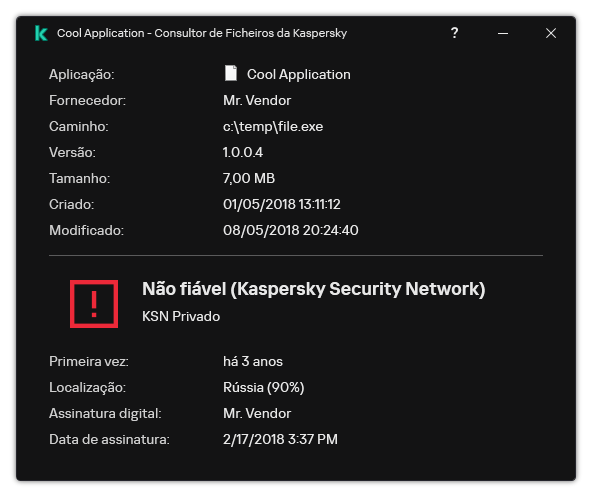 Fiável (Kaspersky Security Network). A maioria dos utilizadores da Kaspersky Security Network confirmou que o ficheiro é fiável.