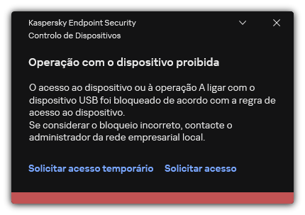 Quando um dispositivo que está bloqueado pelo Controlo de Dispositivos é ligado ao computador, o Kaspersky Endpoint Security bloqueará o acesso e apresentará uma notificação (ver a figura abaixo).