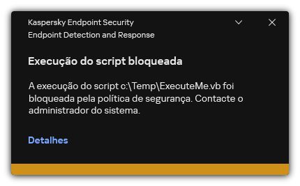 Deste modo, o Kaspersky Endpoint Security bloqueia a execução de objetos: execução de scripts e ficheiros executáveis, abertura de ficheiros do formato do Office. No entanto, ainda que a execução do script esteja bloqueada, pode, por exemplo, abrir o ficheiro script file num editor de texto. Ao bloquear a execução de um objeto, o Kaspersky Endpoint Security apresenta uma notificação padrão (ver figura abaixo) se as notificações estiverem ativadas nas definições da aplicação.