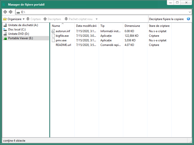 Kaspersky Endpoint Security va cripta fișierele de pe unitatea amovibilă. Aplicația Manager de fișiere portabil utilizată pentru lucrul cu fișiere criptate va fi și ea adăugată pe unitatea amovibilă. Dacă există deja fișiere criptate pe unitatea amovibilă, Kaspersky Endpoint Security le va cripta din nou folosind propria sa cheie. Acest lucru permite utilizatorului să acceseze toate fișierele de pe unitatea amovibilă în modul portabil.