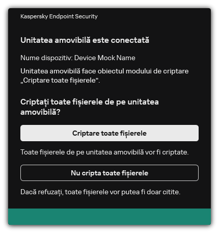 Dacă utilizatorul inițiază eliminarea în siguranță a unei unități amovibile în timpul criptării datelor, Kaspersky Endpoint Security întrerupe procesul de criptare a datelor și permite eliminarea unității amovibile înainte de finalizarea procesului de criptare. Criptarea datelor va fi continuată data viitoare când unitatea amovibilă este conectată la acest computer.