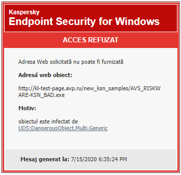 Când un utilizator încearcă să deschidă un site web periculos sau de tip phishing, Kaspersky Endpoint Security va bloca accesul și va afișa un avertisment (vedeți figura de mai jos).