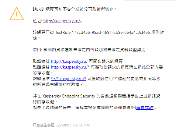 “Web 控制”管理使用者對 Web 資源的存取。這有助於減少流量和工作時間的不當使用。當使用者嘗試開啟受“Web 控制”限制的網站時,Kaspersky Endpoint Security 將封鎖存取或顯示警告(請參見下圖)。