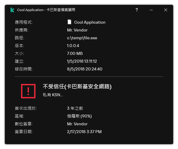Kaspersky Endpoint Security 還會顯示有關檔案的其他資訊(請參見下圖)。