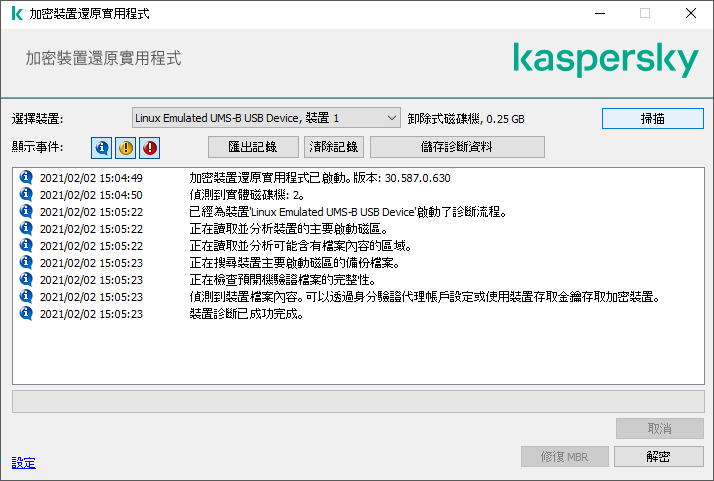 如果電腦可以存取 Kaspersky Endpoint Security 加密功能,“還原實用工具”將提示您解鎖裝置。解鎖裝置並不進行解密,解鎖的裝置將可以直接存取。如果電腦不可以存取 Kaspersky Endpoint Security 加密功能,“還原實用工具”將提示您解密裝置。