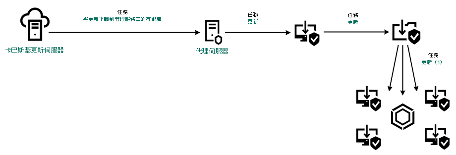 更新套件由 Kaspersky Endpoint Security 的“更新”工作分發到用戶端電腦。您可以為每個管理群組建立無限數量的更新工作。