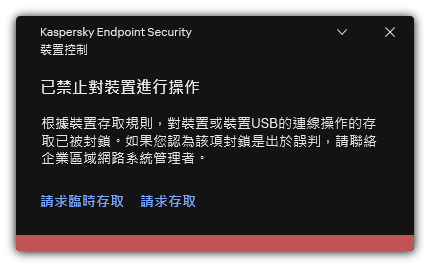 當被“裝置控制”封鎖的裝置連線到電腦時,Kaspersky Endpoint Security 將封鎖存取並顯示通知(請參見下圖)。