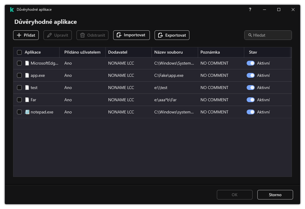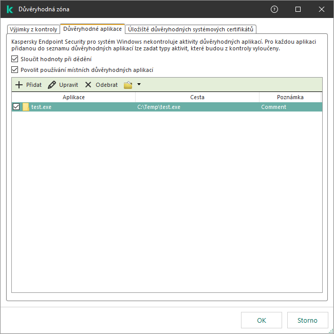 Seznam důvěryhodných aplikací je seznam aplikací, jejichž činnost se soubory a v síti (včetně škodlivé činnost) a přístup k systémovému registru nejsou aplikací Kaspersky Endpoint Security sledovány. Aplikace Kaspersky Endpoint Security ve výchozím nastavení kontroluje objekty, které jsou otevírané, spouštěné nebo ukládané jakýmkoli procesem aplikace, a kontroluje činnost všech aplikací a veškerý síťový provoz, který tyto aplikace vygenerují. Aplikace, která byla přidána do seznamu důvěryhodných aplikací, je však z kontroly aplikací Kaspersky Endpoint Security vyloučena.