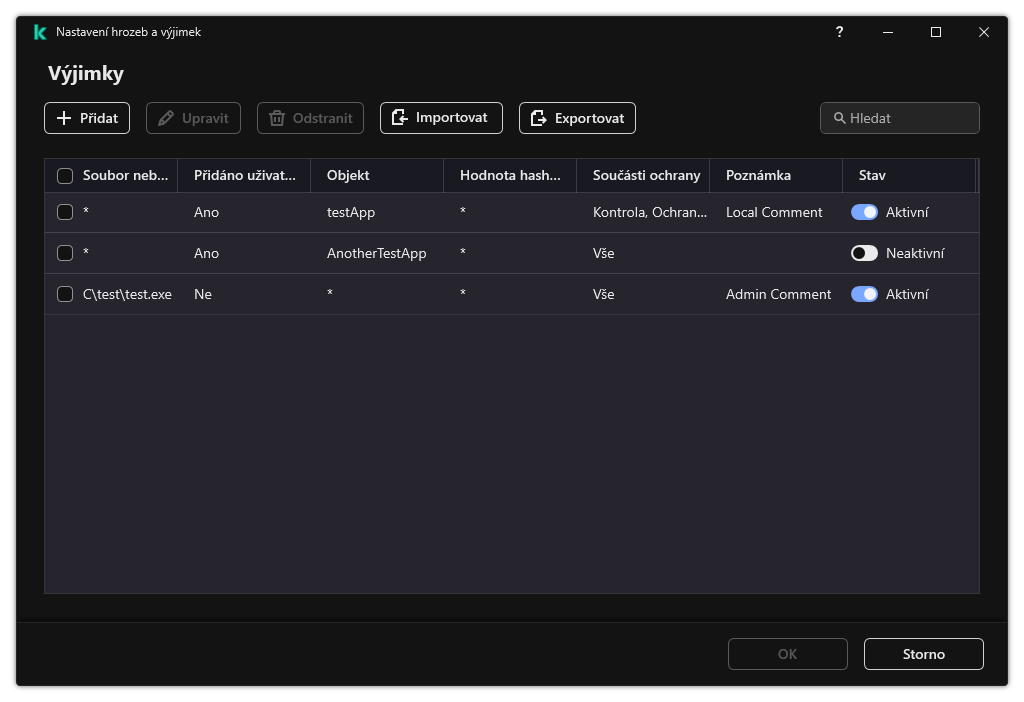Otevře se okno obsahující seznam výjimek z kontroly.