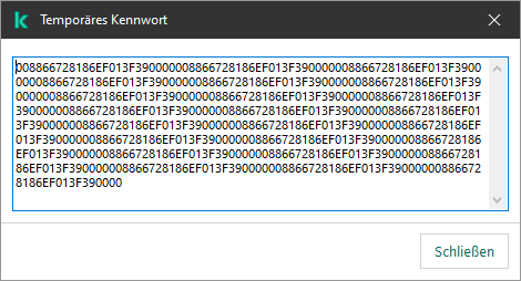 Mit dem temporären Kennwort können Sie für einen einzelnen Computer außerhalb des Unternehmensnetzwerks den temporären Zugriff auf Kaspersky Endpoint Security gewähren. Dies ist erforderlich, um die Ausführung einer verbotenen Aktion zu erlauben, ohne dem Benutzer die KLAdmin-Anmeldedaten zu übergeben. Um ein temporäres Kennwort zu verwenden, muss der Computer in Kaspersky Security Center hinzugefügt werden.
