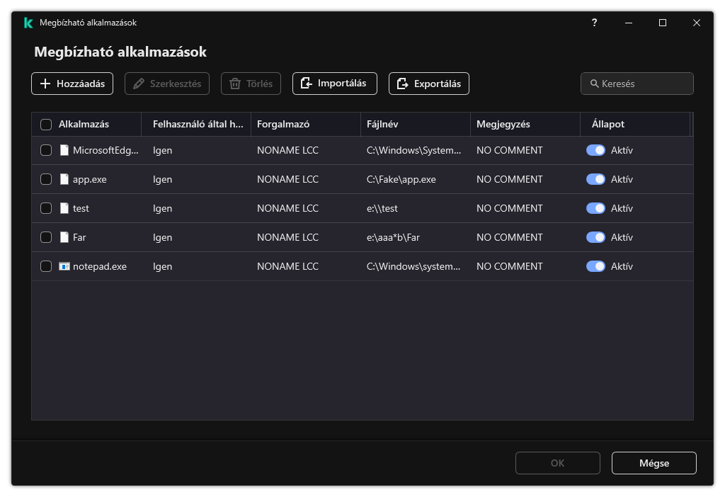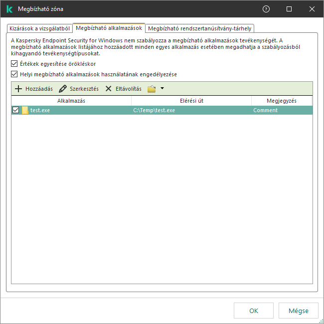 A megbízható alkalmazások listája azon alkalmazások listája, amelyeknek fájl- és hálózati tevékenységét (ideértve a rosszindulatú tevékenységet is) és a rendszer beállításjegyzékéhez való hozzáférését a Kaspersky Endpoint Security nem kíséri figyelemmel. A Kaspersky Endpoint Security alapértelmezés szerint megvizsgálja a megnyitott, végrehajtott vagy bármilyen alkalmazásfolyamat által mentett objektumokat, és felügyeli az összes alkalmazás tevékenységét és az általuk generált hálózati forgalmat. A megbízható alkalmazások listájához hozzáadott alkalmazást azonban a Kaspersky Endpoint Security kizárja a vizsgálatokból.