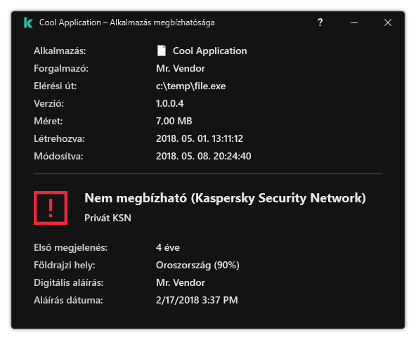 Nem megbízható (Kaspersky Security Network). Vírus vagy más alkalmazás, amely fenyegetést jelent.