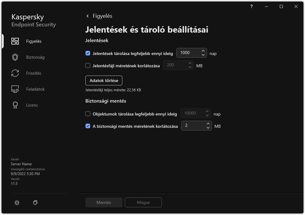A Kaspersky Endpoint Security által naplózott eseményekről szóló jelentések maximális tárolási időtartama alapértelmezett esetben 30 nap. Ezt követően a Kaspersky Endpoint Security automatikusan törli a jelentésfájlban lévő legrégebbi bejegyzéseket.