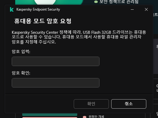 이동식 드라이브가 컴퓨터에 연결되어 있는 동안에도 이동식 드라이브 접근 권한을 변경할 수 있습니다. 이동식 드라이브 접근 권한이 변경되면 Kaspersky Endpoint Security는 파일에 대한 접근을 차단하고 암호를 다시 입력하라는 메시지를 표시합니다.
