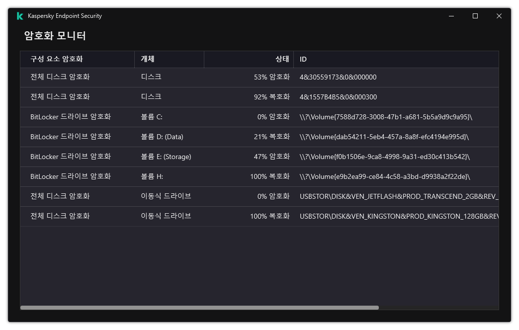 암호화 모니터 도구를 사용하여 사용자 컴퓨터의 디스크 암호화 또는 복호화 프로세스를 제어할 수 있습니다. 메인 애플리케이션 창에서 암호화 모니터 도구를 실행할 수 있습니다.