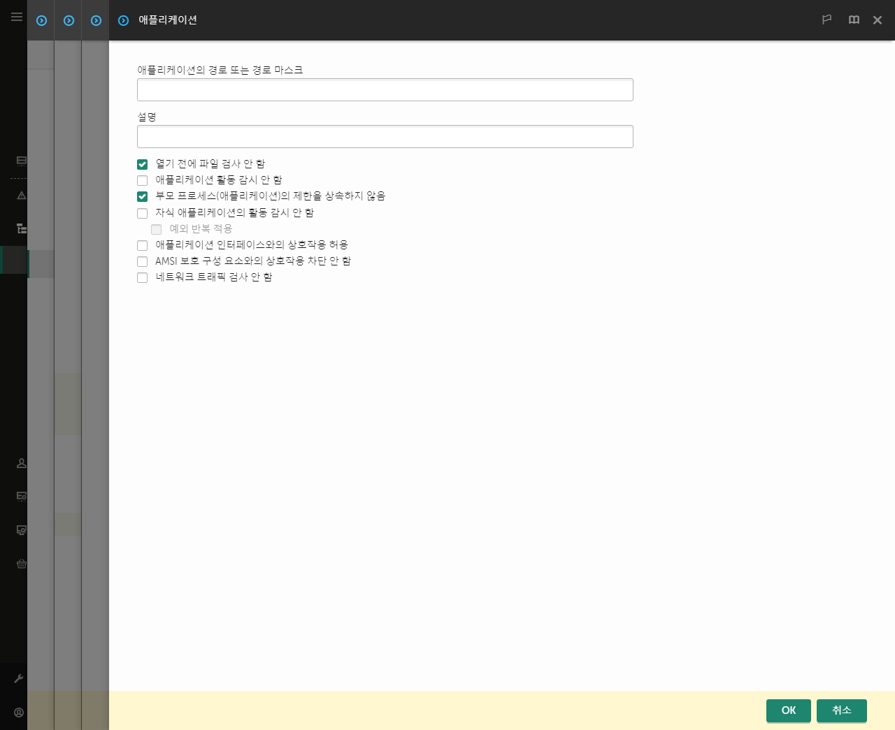 이렇게 해도 실행 파일과 신뢰하는 애플리케이션 프로세스에 대해서는 계속 바이러스와 기타 악성 코드 검사가 수행됩니다. 검사 예외를 사용하여 애플리케이션을 Kaspersky Endpoint Security 검사에서 완전히 예외시킬 수 있습니다.