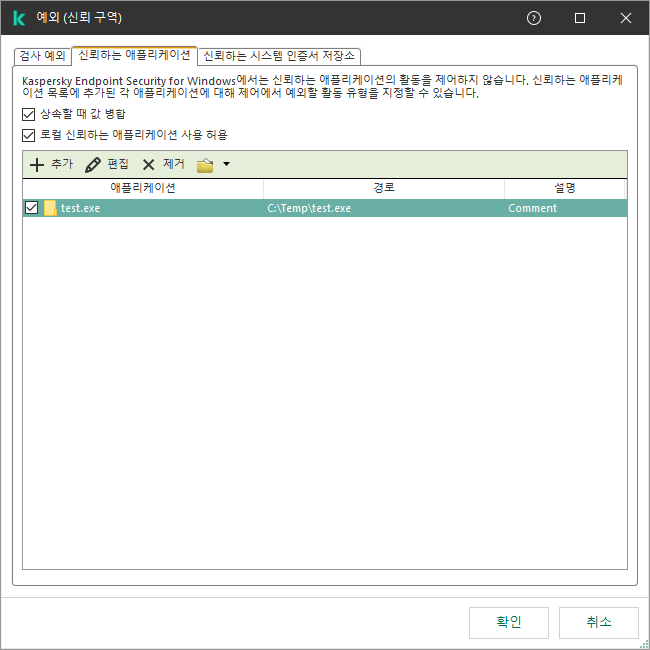 신뢰하는 애플리케이션 목록은 Kaspersky Endpoint Security에서 파일 및 네트워크 활동(악성 활동 포함)과 시스템 레지스트리 접근을 감시하지 않는 애플리케이션 목록입니다. 기본적으로 Kaspersky Endpoint Security는 다른 애플리케이션 프로세스에서 열려 있거나 실행하거나 저장하는 개체를 검사하고 모든 애플리케이션 활동과 그로 인해 생성되는 네트워크 트래픽을 제어합니다. 그러나 신뢰하는 애플리케이션 목록에 추가된 애플리케이션은 Kaspersky Endpoint Security의 검사에서 제외됩니다.