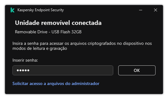 Se esqueceu a senha para trabalhar no modo portátil, você deve conectar a unidade removível a um computador com o Kaspersky Endpoint Security instalado dentro da rede corporativa. Você terá acesso aos arquivos porque a chave secreta é mantida no armazenamento de chaves do computador ou no Servidor de Administração. Descriptografe e recriptografe os arquivos com uma nova senha.