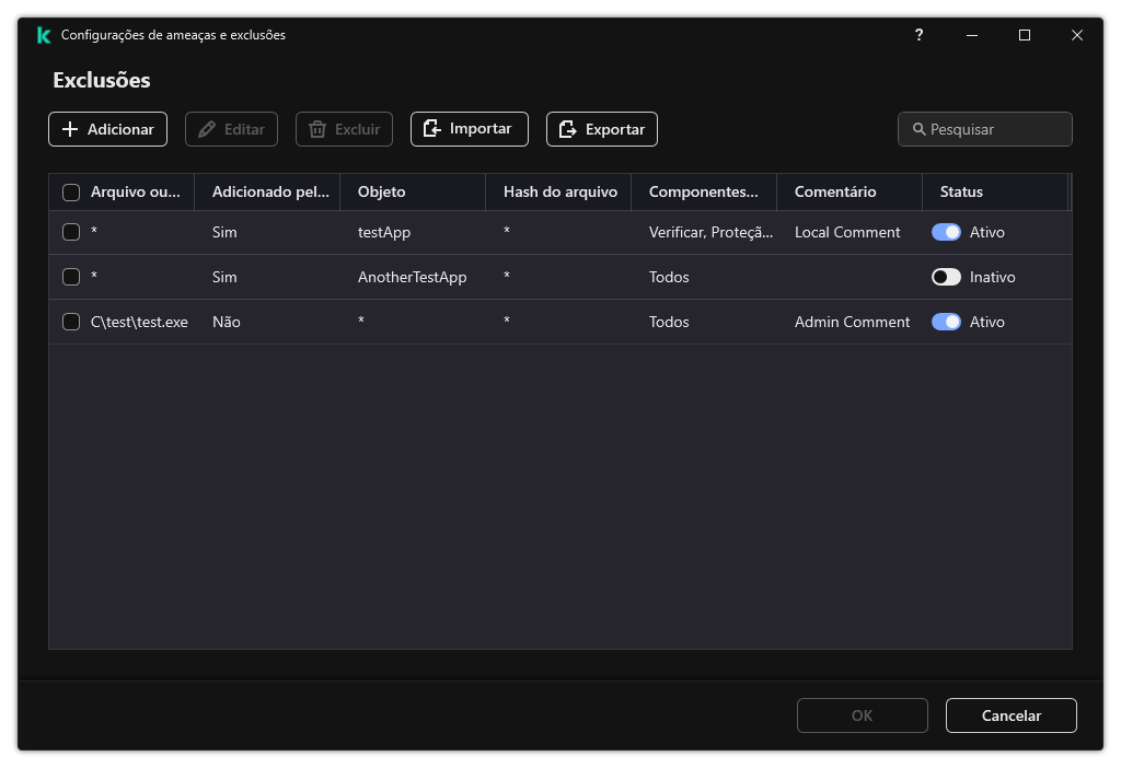 Uma exclusão de verificação é um conjunto de condições que devem ser atendidas para que o Kaspersky Endpoint Security não verifique um determinado objeto em busca de vírus e outras ameaças.