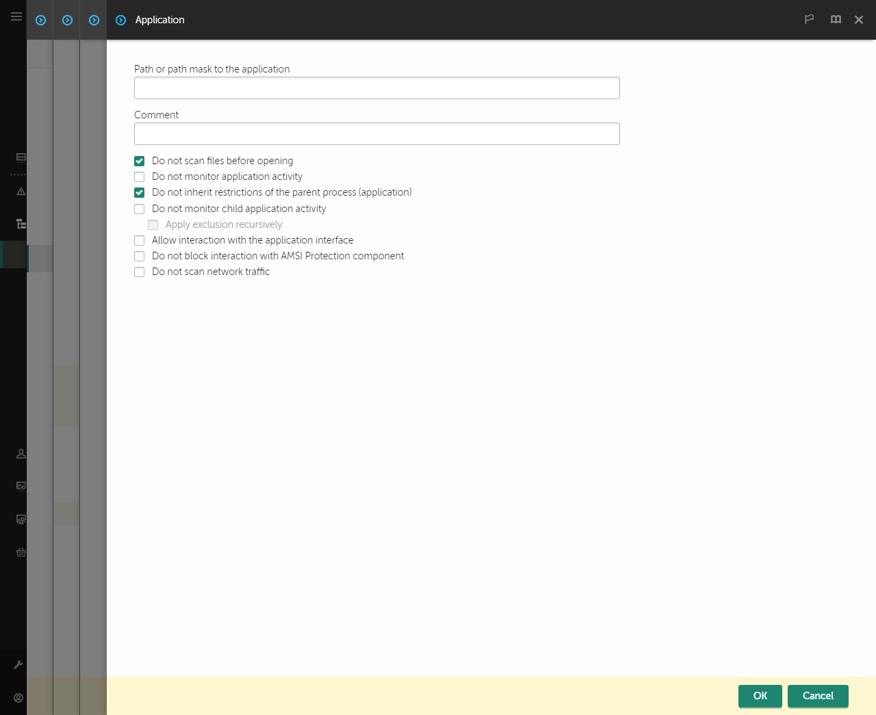 O Kaspersky Endpoint Security não monitorizará a atividade de ficheiros ou de rede de aplicações iniciadas por esta aplicação.