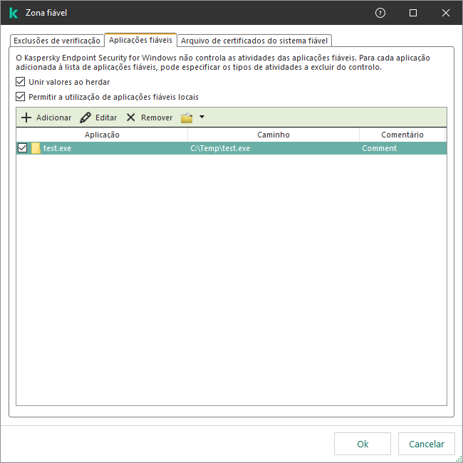 A lista de aplicações fiáveis é uma lista de aplicações cujos ficheiros e atividade de rede (incluindo a atividade maliciosa) e o acesso ao registo do sistema não são monitorizados pelo Kaspersky Endpoint Security. Por predefinição, o Kaspersky Endpoint Security verifica objetos que sejam abertos, executados ou guardados por qualquer outro processo da aplicação e controla a atividade de todas as aplicações e tráfego de rede gerado pelos mesmos. Contudo, uma aplicação que tenha sido adicionada à lista de aplicações fiáveis fica excluída das verificações pelo Kaspersky Endpoint Security.