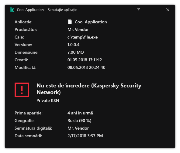 Nu este de încredere (Kaspersky Security Network). Un virus sau o altă aplicație care reprezintă o amenințare.