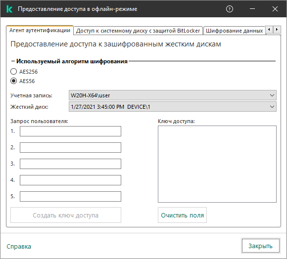 В результате содержимое блоков ответа на запрос пользователя о восстановлении имени и пароля учетной записи Агента аутентификации отобразится в поле Ключ доступа. Передайте содержимое блоков ответа пользователю.