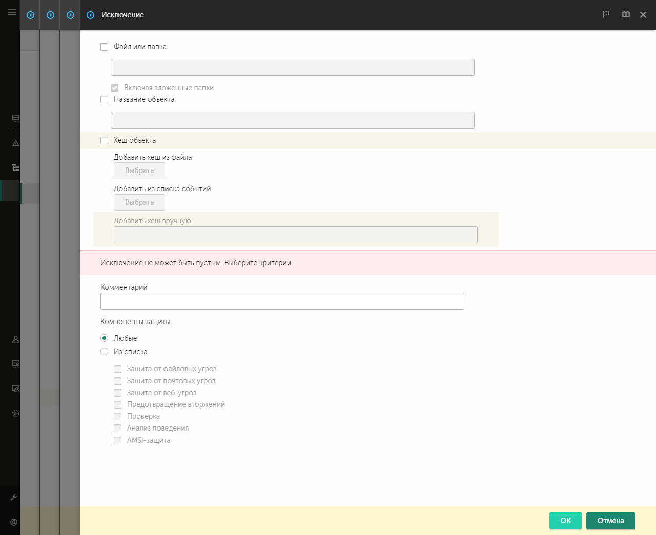 - Выберите способ добавления исключения: Файл или папка, Название объекта или Хеш объекта.