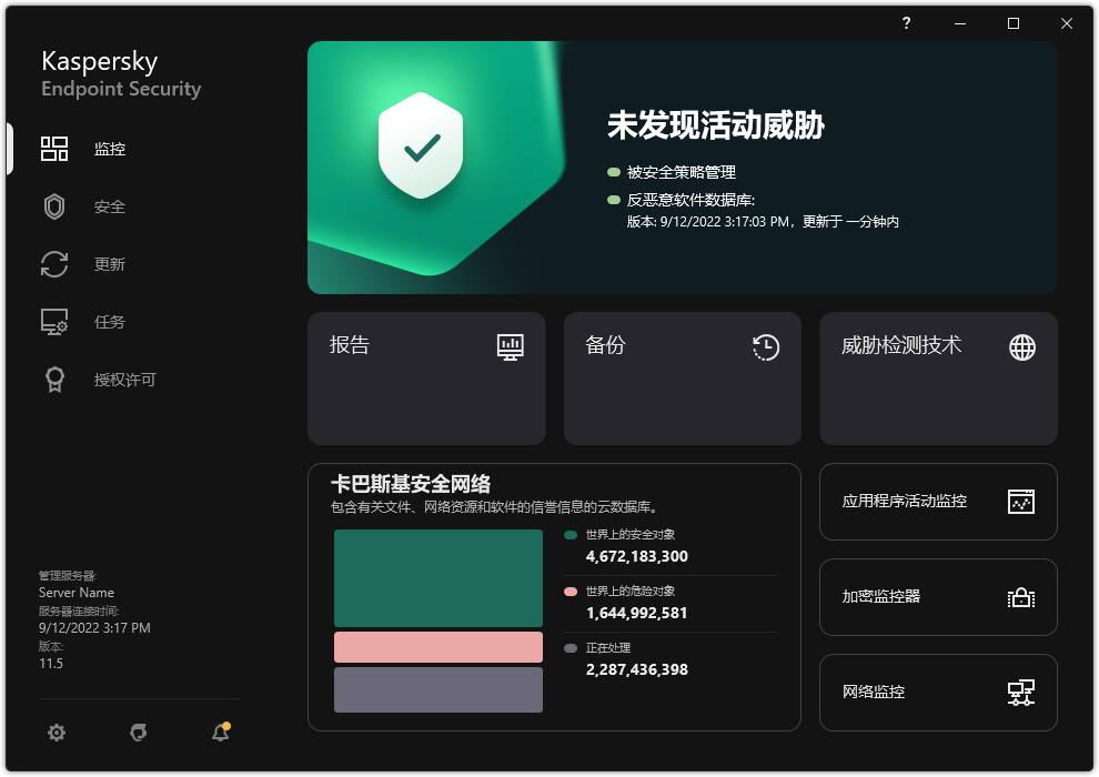 • 卡巴斯基安全网络”。Kaspersky Endpoint Security 和卡巴斯基安全网络之间的连接状态,以及全球 KSN 统计信息。卡巴斯基安全网络 (KSN) 是一个云服务的基础架构。它可以访问在线卡巴斯基知识库。该知识库中包含了文件信誉、网页资源和软件的相关信息。使用卡巴斯基安全网络的数据可确保 Kaspersky Endpoint Security 能够更快地对新威胁作出响应,提高一些保护组件的性能,并减少误报风险。如果您正在参与卡巴斯基安全网络,KSN 服务将为 Kaspersky Endpoint Security 提供有关所扫描文件的类别和信誉的信息,以及有关所扫描网址的信誉的信息。