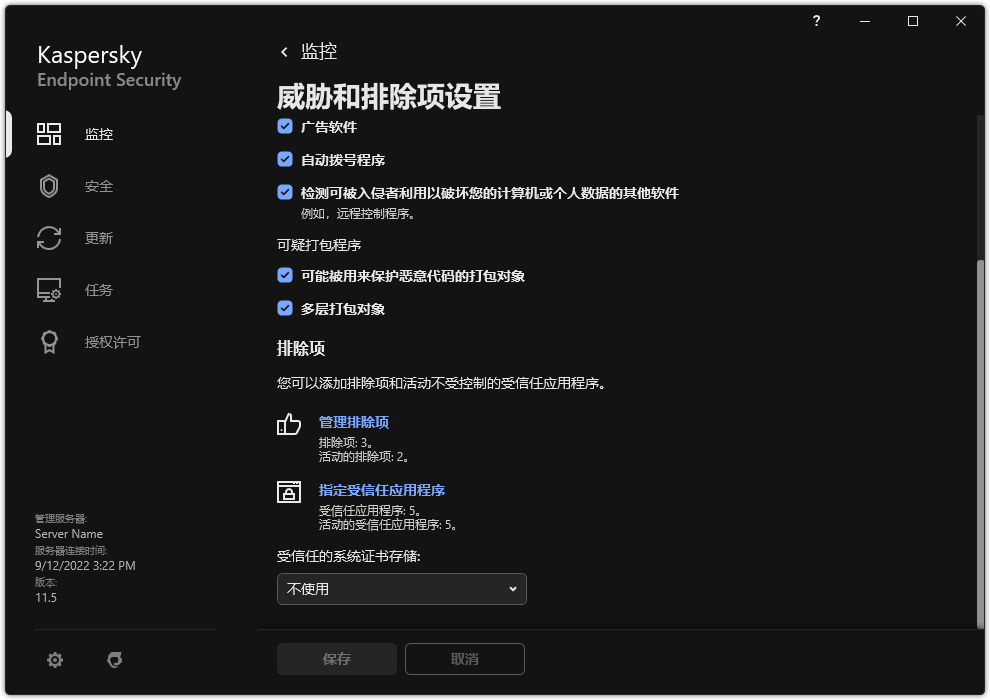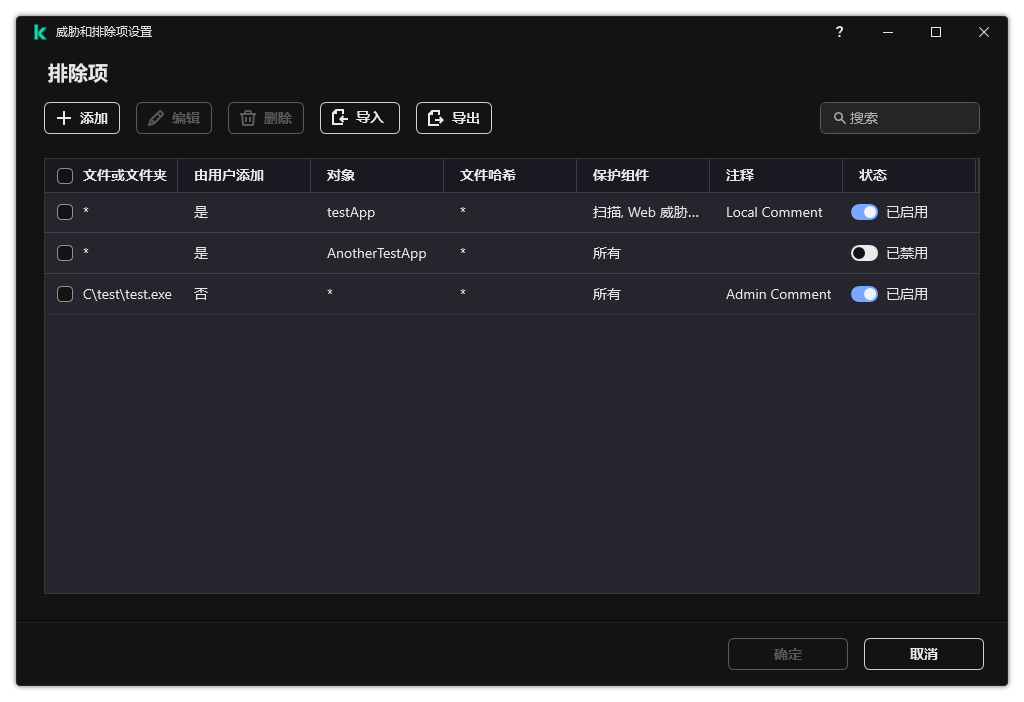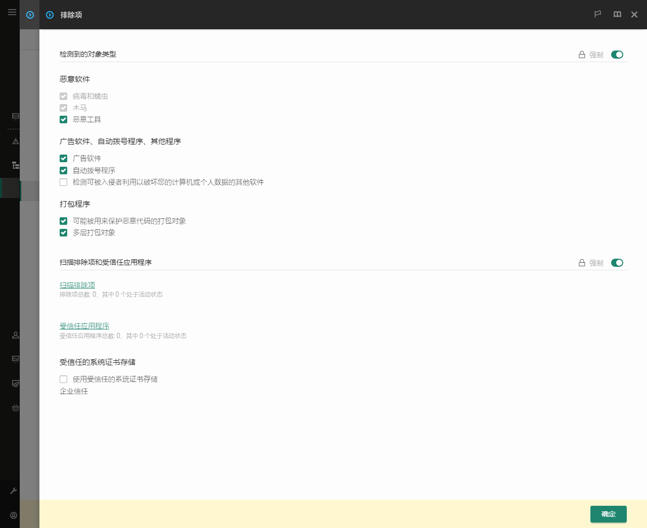 “扫描排除项”是一组条件,必须满足这些条件,Kaspersky Endpoint Security 才不会扫描特定对象是否存在病毒和其他威胁。