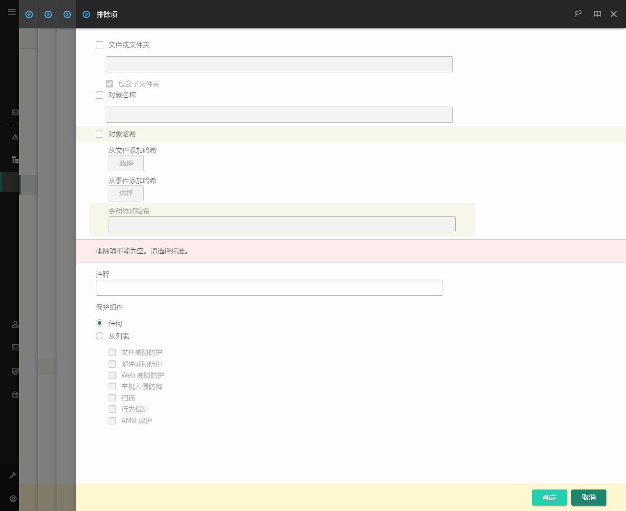 - 如果您要从扫描排除单个文件,在对象哈希字段输入文件哈希。