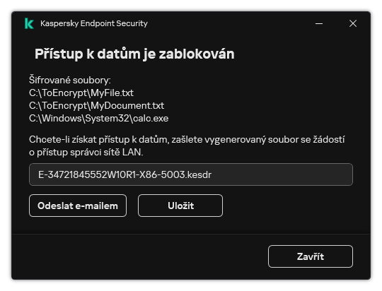 Aplikace Kaspersky Endpoint Security vygeneruje soubor se žádostí o přístup ke všem šifrovaným souborům uloženým na jednotce počítače (místní jednotka nebo vyměnitelná jednotka).