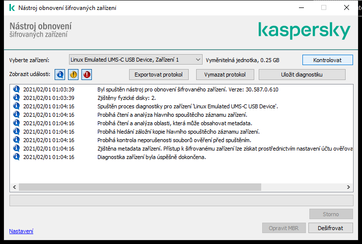 - Kliknutím na tlačítko Kontrola umožníte nástroji určit akce, které se mají se zařízením provést: zda má být odemknuto nebo dešifrováno.