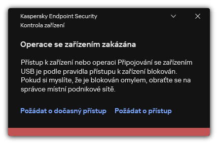 Když je k počítači připojeno zařízení, které je blokováno součástí Kontrola zařízení, aplikace Kaspersky Endpoint Security zablokuje přístup a zobrazí upozornění (viz obrázek níže).