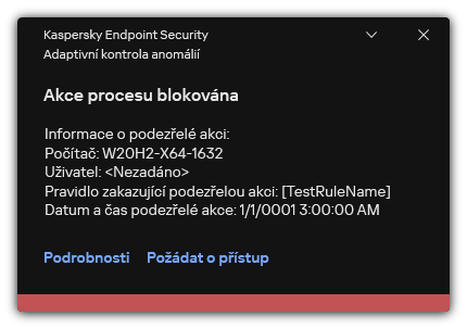 Zpráva o blokování. Šablona zprávy, která se zobrazí uživateli, když je spuštěno pravidlo součásti Adaptivní kontrola anomálií, které blokuje netypickou akci. Zpráva správci. Šablona zprávy, kterou uživatel může zaslat správci místní podnikové sítě, pokud považuje blokování za chybu. Poté, co uživatel požádá o poskytnutí přístupu, Kaspersky Endpoint Security odešle událost do aplikace Kaspersky Security Center: Zpráva o blokování aktivity aplikace určená pro správce. Popis události obsahuje zprávu správci s nahrazenými proměnnými. Tyto události můžete zobrazit v konzole aplikace Kaspersky Security Center pomocí předdefinovaného výběru událostí User requests. Pokud vaše organizace nemá nasazenou aplikaci Kaspersky Security Center nebo není k dispozici připojení k serveru pro správu, aplikace odešle zprávu správci na zadanou e-mailovou adresu. |