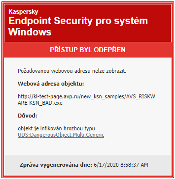 Když se uživatel pokusí otevřít škodlivý nebo phishingový web, aplikace Kaspersky Endpoint Security zablokuje přístup a zobrazí upozornění (viz obrázek níže).