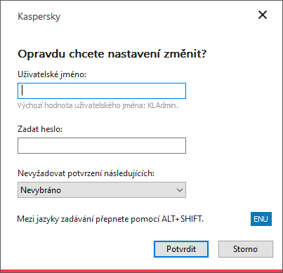 Když se uživatel pokusí provést akci chráněnou heslem, aplikace Kaspersky Endpoint Security vyzve uživatele k zadání uživatelského jména a hesla nebo dočasného hesla (viz obrázek níže).