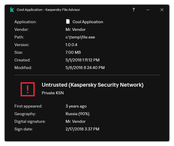 Kaspersky Endpoint Security displays the KSN solution that was used to determine the reputation of the file: Global KSN or Private KSN.