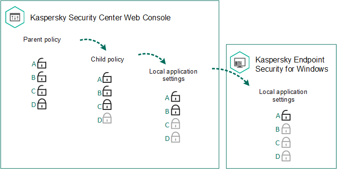Policies, like administration groups, are arranged in a hierarchy. By default, a child policy inherits settings from the parent policy. Child policy is a policy for nested hierarchy levels, that is a policy for nested administration groups and secondary Administration Servers. You can disable the inheritance of settings from the parent policy.