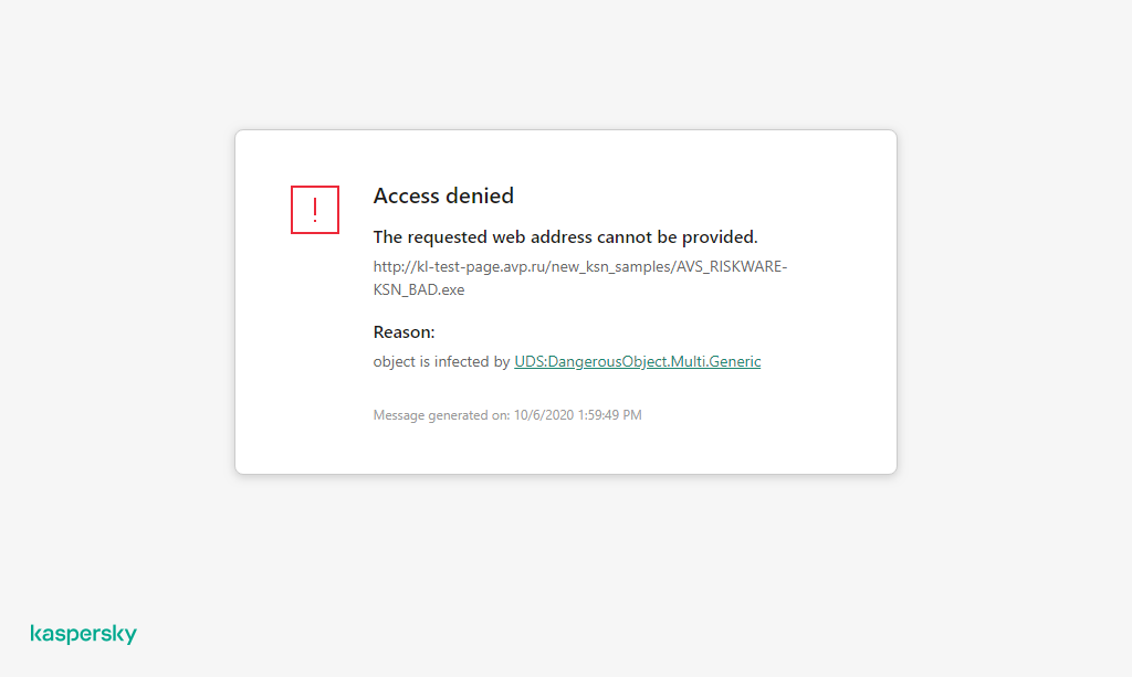 When a user tries to open a malicious or phishing website, Kaspersky Endpoint Security will block access and show a warning (see the figure below).