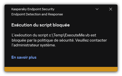 Kaspersky Endpoint Security interdit alors l'exécution des objets : exécution de fichiers exécutables et de scripts, ouverture de fichiers au format Office. Vous pouvez toutefois ouvrir un fichier de script dans un éditeur de texte, même si l'exécution du script est interdite. Lors de l'interdiction de l'exécution d'un objet, Kaspersky Endpoint Security affiche une notification standard (cf. Illustration ci-dessous) si les notifications sont activées dans les paramètres des applications.