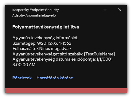 Ha egy szabály betartását a tanulási időszak során egyszer se váltották ki, akkor az Adaptív Anomáliafelügyelő az adott szabályhoz kapcsolódó tevékenységeket gyanúsnak fogja minősíteni. A Kaspersky Endpoint Security le fog tiltani az adott szabályhoz kapcsolódó minden tevékenységet.