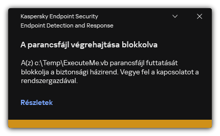 Ennek eredményeként a Kaspersky Endpoint Security blokkolja az objektumok végrehajtását: futtatható fájlok és szkriptek futtatása, Office-formátumú fájlok megnyitása. Azonban megnyithat például egy parancsfájlt egy szövegszerkesztőben, még akkor is, ha a szkript futtatása meg van akadályozva. Amikor blokkolja egy objektum végrehajtását, a Kaspersky Endpoint Security szabványos értesítést jelenít meg (lásd az alábbi ábrát), ha az értesítések engedélyezve vannak az alkalmazás beállításaiban.